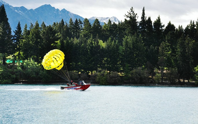 大清早的湖面已有游人进行户外运动。滑水伞,滑翔伞,潜水艇,漂流,各有所爱。皇后镇以丰富的户外活动闻名于世,被誉为户外运动的天堂。有胆量可以考虑前往世界蹦极发源地卡瓦劳蹦极大桥(Kawarau Bridge Bungy)试试终身一跃的感觉。