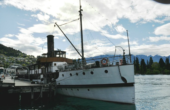停泊岸边1912年正式下水的是厄恩斯劳号蒸汽船 TSS Earnslaw,如今这位“水上贵妇”已年过100周岁了。100年前,和泰坦尼克号同岁的TSS Earnslaw作为湖上交通工具被用于运输牛羊,车辆及当地居民。行驶的范围包括皇后镇和瓦卡蒂普湖的南北两端的小镇金斯顿Kingston和格林洛奇Glenorchy。如今的她虽然已满百岁,饱经风霜,但是在当地人的细心照料下,还是风貌依旧,一百年的历史让她更加具有贵族气质。公路建设改变了古老的运输模式,上世纪60年代,旅游公司买了这艘船,那个时候起,它变身为游船。