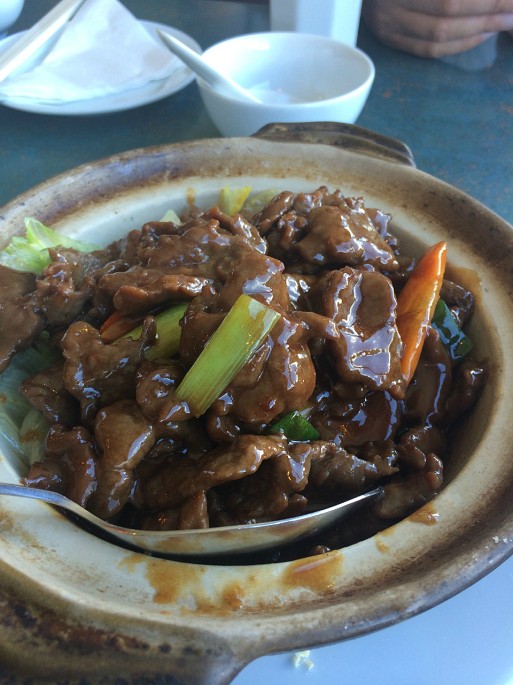 集市对面有一间唐餐馆:湖景皇宫。出来多天越发想念家乡的味道,这家餐馆是一个广州人开的餐厅,正宗粤菜合我们口味。用生长在纯净大自然中的走地牛烹调出来的牛肉煲和养在洁净的海域中的肉质饱满而鲜美的新西兰特产青口贝,加上一道久违了的蒜蓉炒青菜,就这样,我们美美的饱吃一顿。