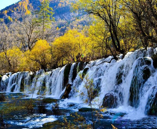 叠瀑:九寨沟是水的世界,也是瀑布王国。所有的瀑布全都从密林里狂奔出来。这里有宽度居全国之冠的诺日朗瀑布,它在高高的翠岩上急泻倾挂,似巨幅品帘凌空飞落,雄浑壮丽。有的瀑布从山岩上腾越呼啸,几经跌宕,形成叠瀑,似一群银龙竟跃,声若滚雪,激溅起无数小水珠,化作迷茫的水雾。朝阳照射,常常出现奇丽的彩虹,使人赏心悦目,流连忘返。