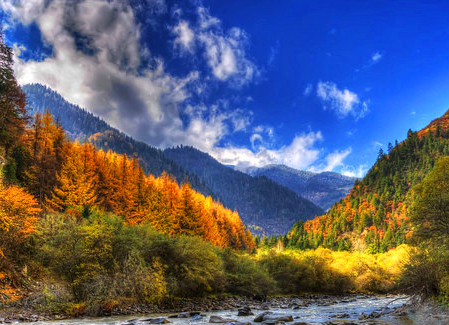 彩林:被誉为九寨沟六绝之三的彩林,覆盖了景区一半以上的面积,2000余种植物,争奇斗艳,林中奇花异草,色彩绚丽,沐浴在朦胧迷离的雾霭中的孓遗植物,浓绿阴森,神秘莫测,林地上积满厚厚的苔藓,散落着鸟兽的翎毛。充满着原始气息的森林风貌,使人产生一种浩渺幽远的世外天地之感。3万顷莽莽苍苍的原始森林,随着季节的变化,呈现出种种奇丽风貌。