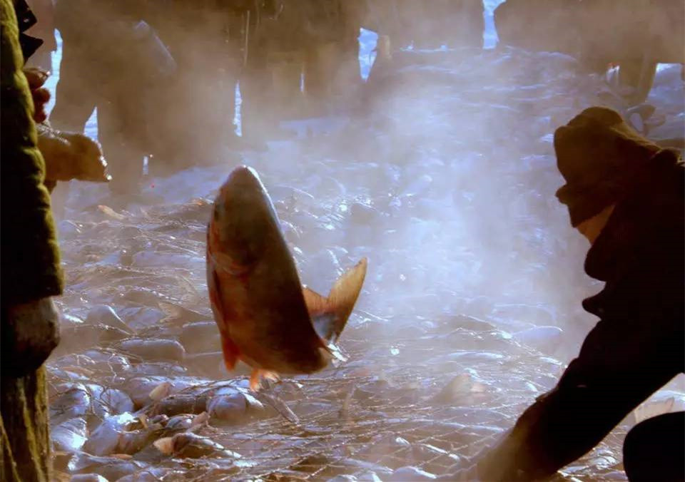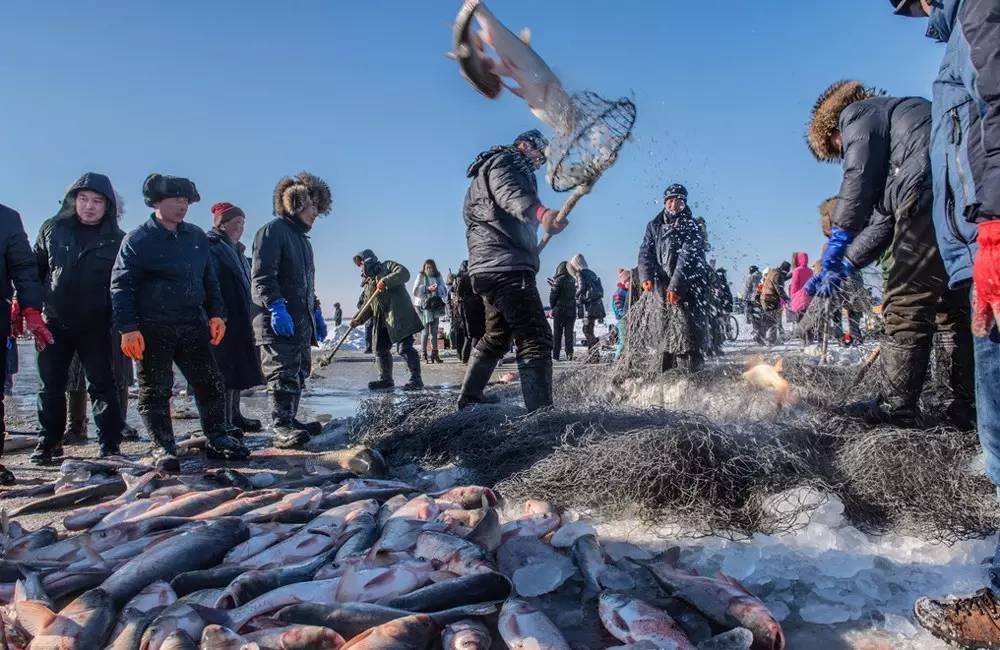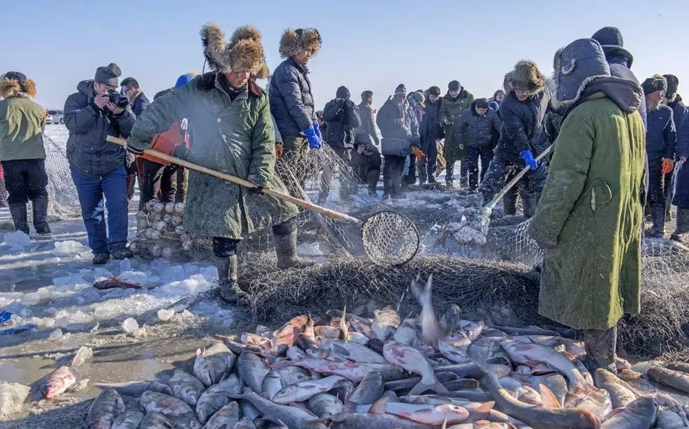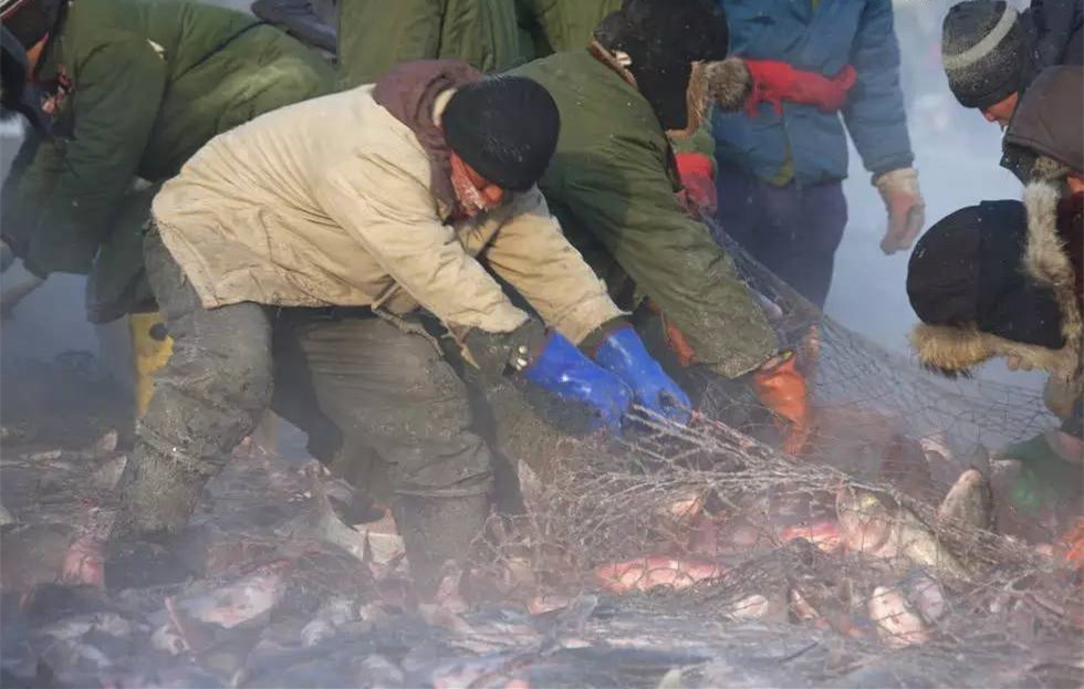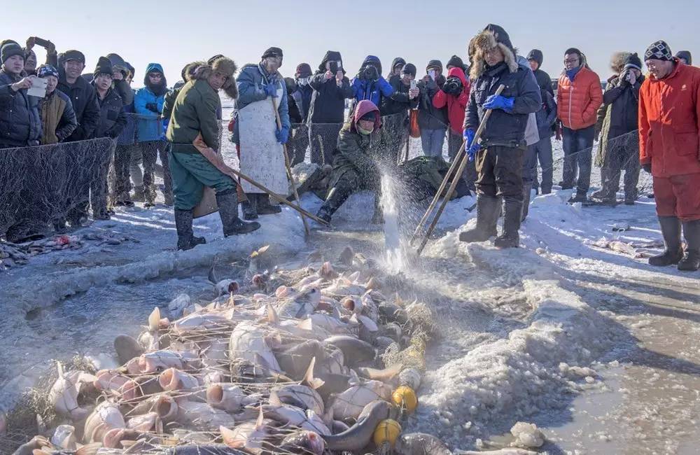 2016年12月22日,吉林省松原市查干湖的冬捕又开始了。冬捕的渔工们在“老渔把头”的带领下齐心协力,拉动绞盘,从50多公分深的冰洞里拽出了今年的第一网鱼。